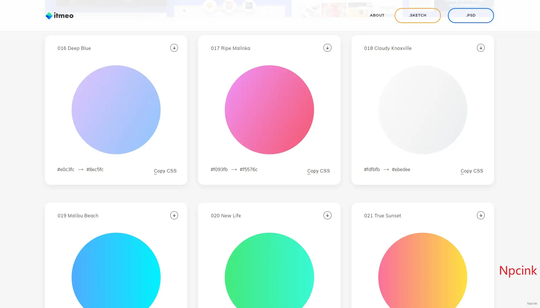 WebGradients??是180個線性漸變的免費集合,您可以將其用作網站任何部分的內容背景。輕松復制CSS3跨瀏覽器代碼,稍后使用!我們還為每個漸變準備了.PNG版本。作為獎勵,有適用于Sketch??&??Photoshop的包裝??。