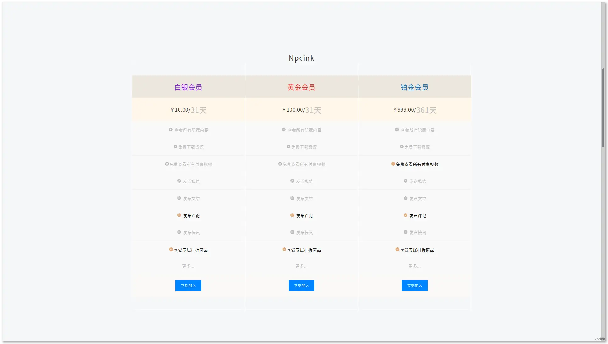 仿94設計素材網vip界面采用了表格的方法對不同的權限進行了切分,看起來更加的清晰和一目了然。