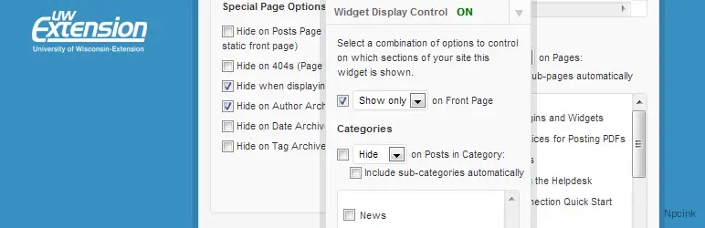 該插件向“小部件”面板上的每個小部件添加了一個表單,該表單允許用戶選擇顯示或隱藏小部件的頁面和/或類別。