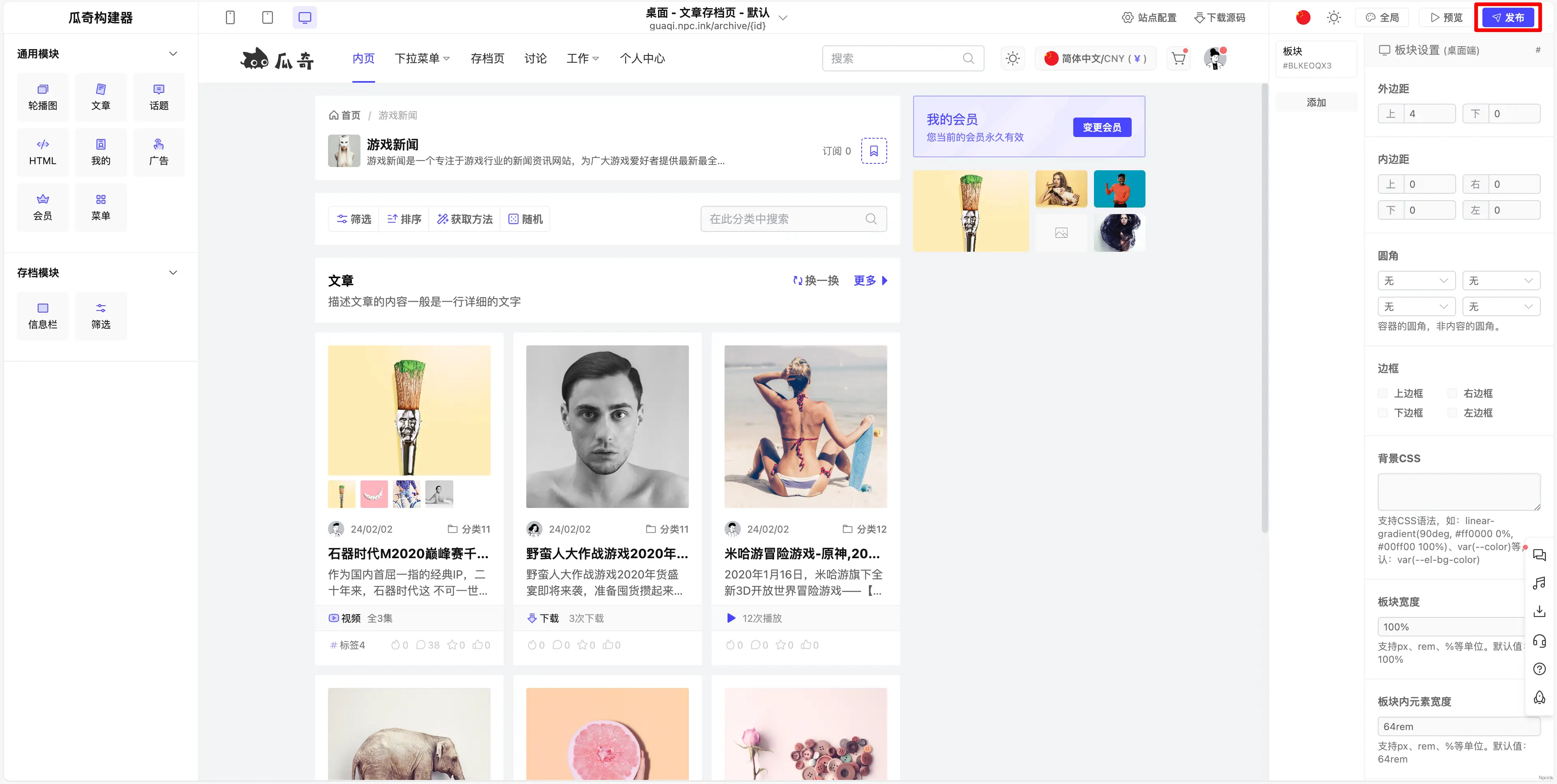 構建完成后,點擊右上角的“發布”按鈕,您就能在“客戶端域名”上看到根據您的構建展示的內容了